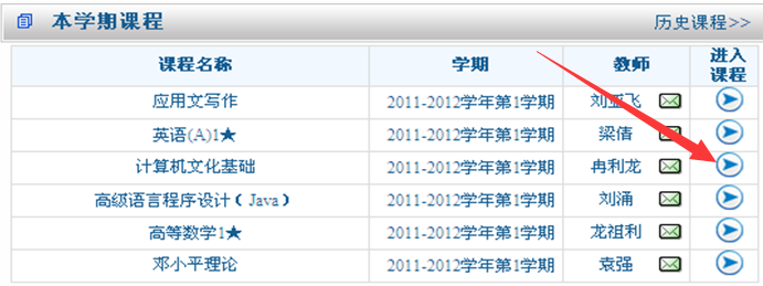2、在学生工作室中,可以在【本学期课程】列表里查看自己本学期所学的所有课程。若要进入某一门课程的学习,单击该课程列表右端进入课程按钮