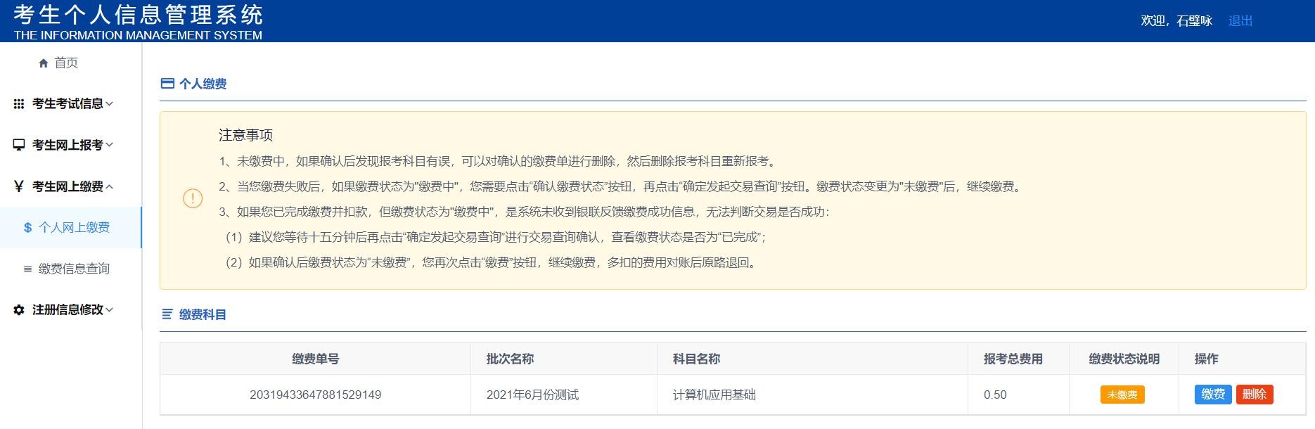 (6)个人网上缴费。科目确认完成后,点击左边菜单栏上的“个人网上缴费”功能,即可对确认的科目进行缴费。如下图: